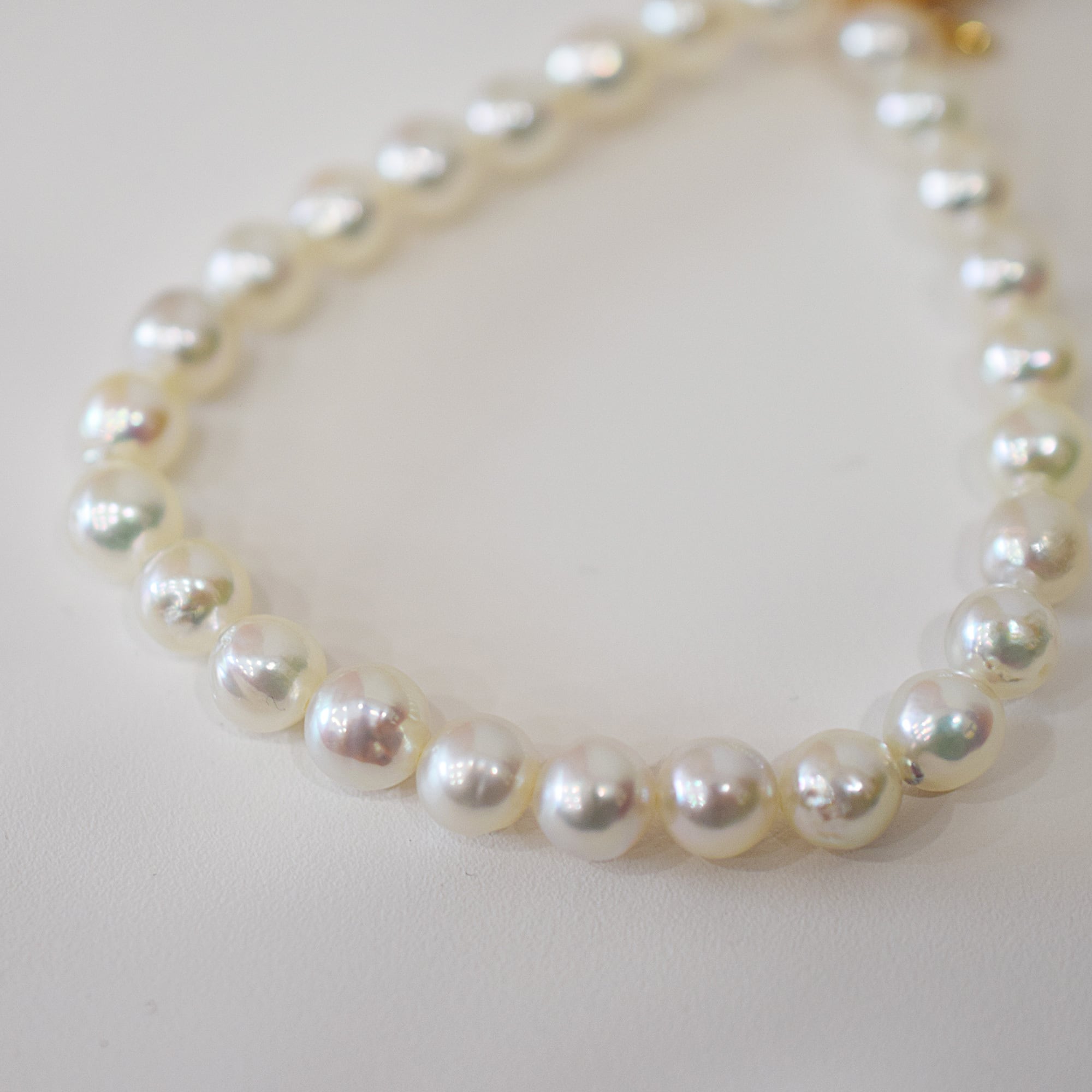 個性的なフォルムが魅力的なあこや真珠のバロックパールブレスレット。バロック特有のコロンとした形が存在感を放ち、ファッションのアクセントに最適です。