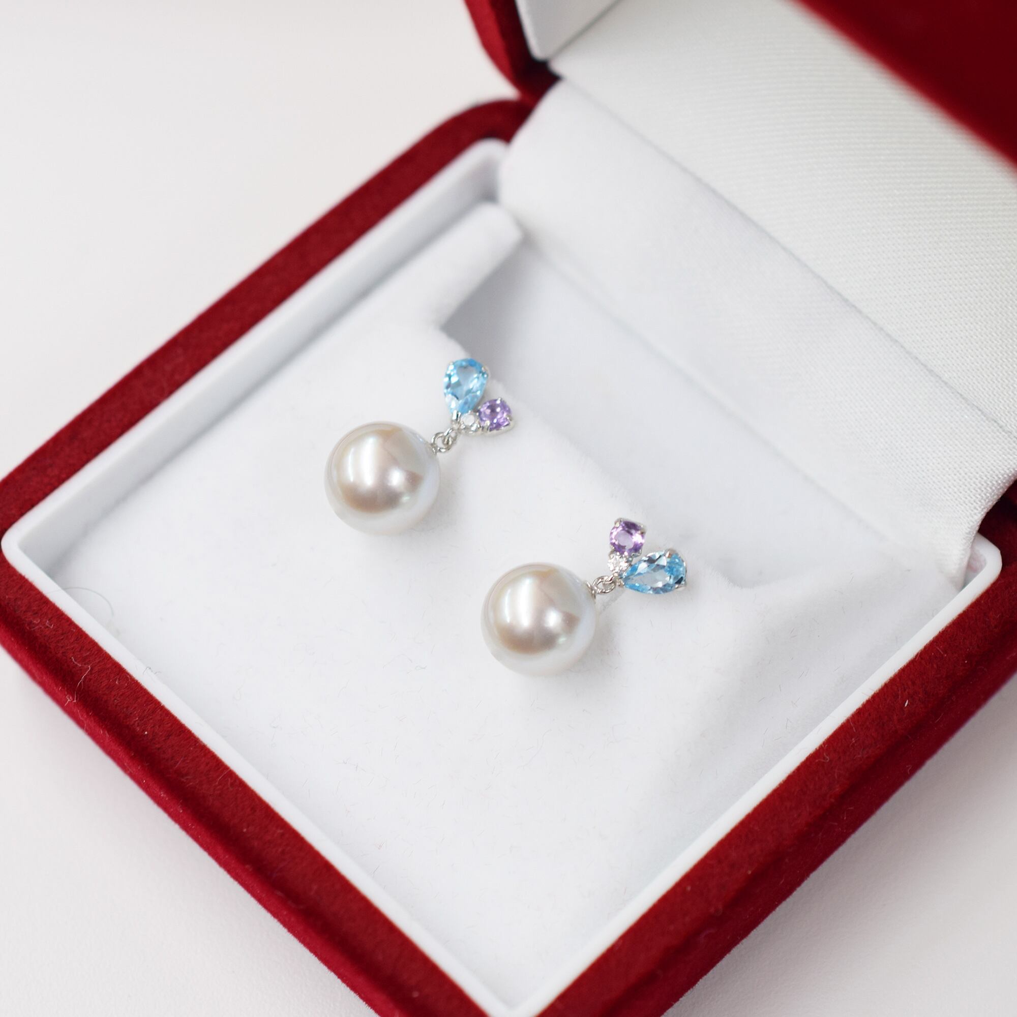 揺れるあこや真珠の照りと半貴石の輝きが美しいパールピアスです。K18YGにはロードライトガーネット、ライトアメジスト、ホワイトトパーズ、K14WGにはブルートパーズ、ライトアメジスト、ホワイトトパーズの半貴石を使用しています。耳元で上品に揺れるピアスは、パーティーや普段のファッションのアクセントにもおすすめです。