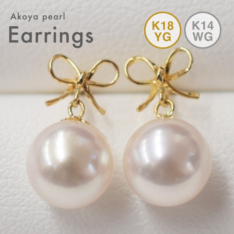 [pearl448] 7.5mm - 8mm リボン ピアス あこや真珠 天草 熊本 綺麗 ペア 普段使い ピンク ホワイト K18 K14